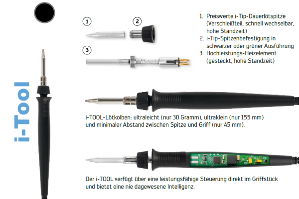 Mit dem i-TOOL hat Ersa einen der kleinsten, leichtesten und leistungsstärksten Lötkolben entwickelt. Mit diesem Lötkolben